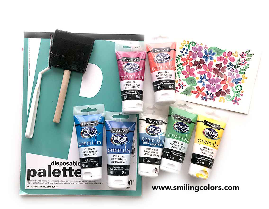 - Create a palette of colors. Choose 5 or 6 colors to use and then mix them with each other or by adding white to create in-between hues of color. Mix in some texture medium to create easy dimension.