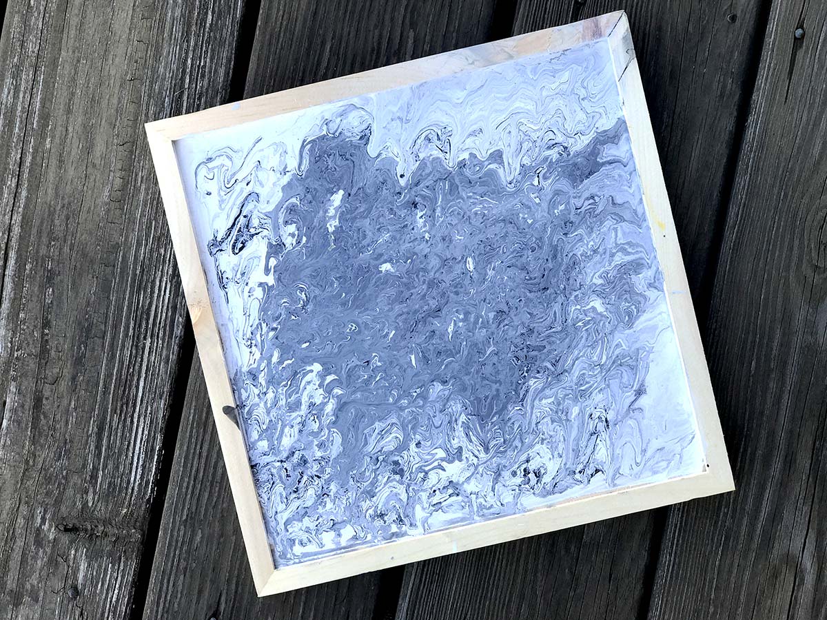 Here I used just black and white alternating them as I go and poured it into a Premade Birch/Pine square frame. The frame made it super easy to hold all the paint in and not waste any! I just love how the black and white contrasts here.