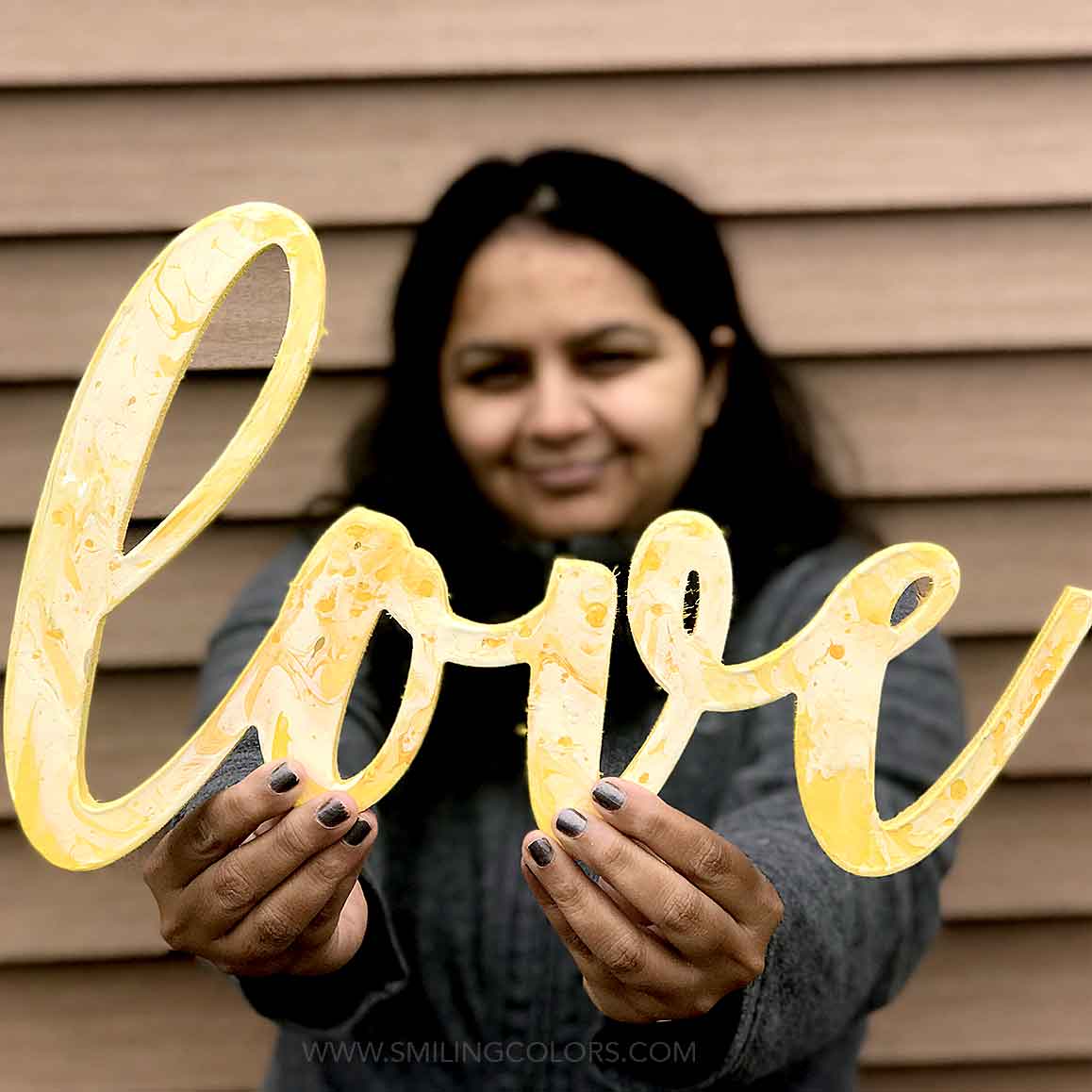 This wooden love sign here was so quick to make and I love the yellow color! This one was for our master bedroom and I have a grey/yellow theme there so it turned out perfect! While pouring on wood, I used the same paint to pouring medium ratio and it turned out fine!