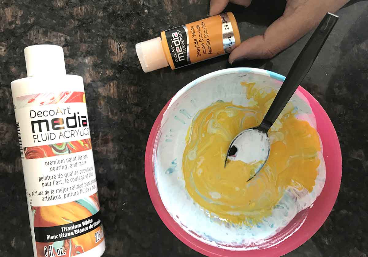 • Figure out your paint recipes: The first step is to prepare your paint. You need to thin your paint with a pouring medium to get the right pouring consistency. For the Fluid acrylic brand I used, the paint recipe was 1:1 paint to pouring medium. If you are using a craft acrylic you might have to use a 1:2 paint to pouring medium ratio. For thicker artist grade paints that come in tubes go for a 1:3 or 1:4 paint to pouring medium recipe.