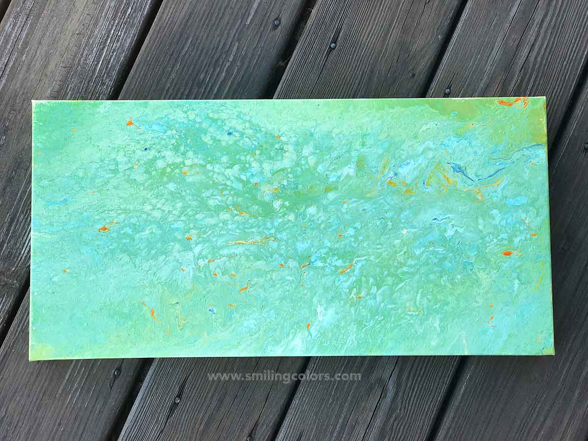 Here is my large canvas. This one is huge and I of course started my paint pouring afternoon with this one. I created a dirty pour of a few pastel colors and in the video you see I actually got a nice mix of colors. But I just did not have enough paint on the canvas. So I created a splatter effect and let the paints move as they wanted. In the end the color scheme turned out pretty alright and I love the movement of color on this canvas.